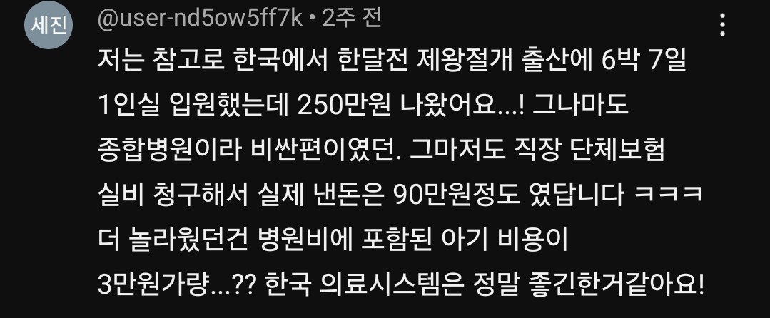 For my information, I was admitted to a single room for 6 nights and 7 days in Korea for a cesarean delivery a month ago and it was 2.5 million won...!