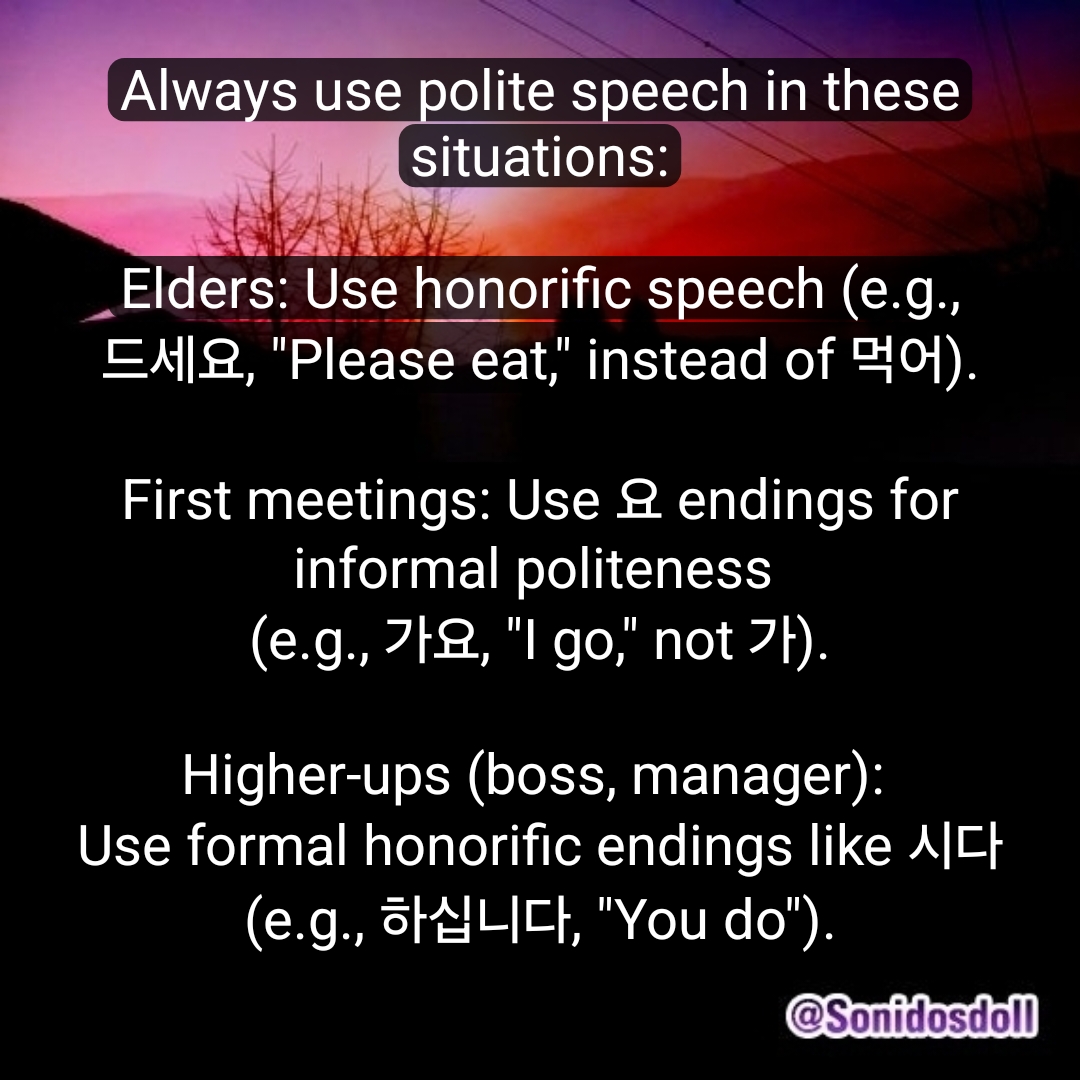 First meetings: Use 요 endings for informal politeness (e.g., 가요, "I go," not 가).