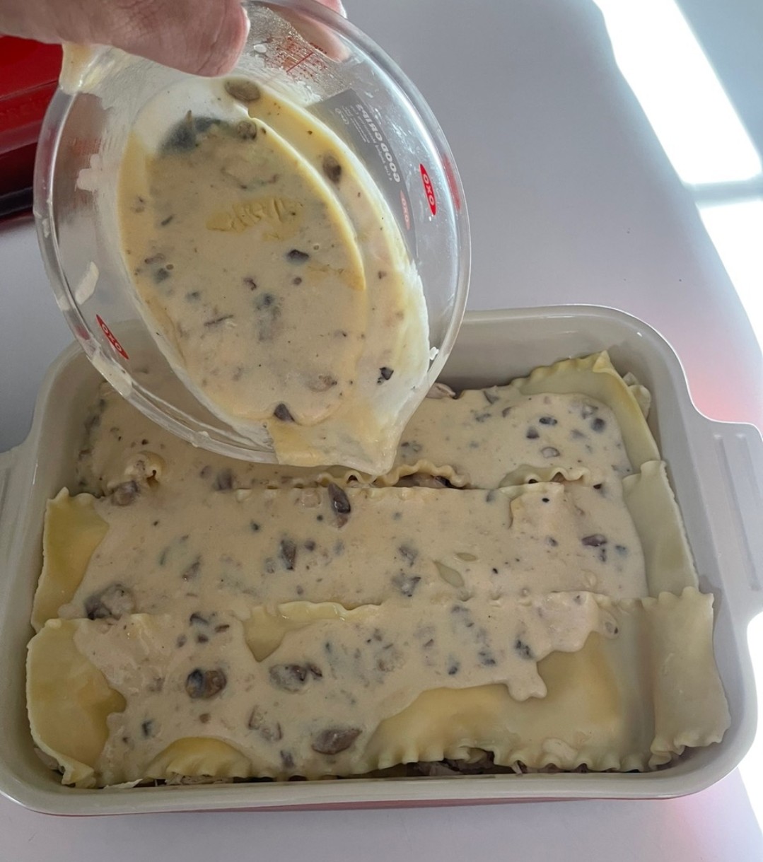 오늘, 나는 화이트 소스와 치즈로 치킨과 버섯 라자냐를 만들었다.