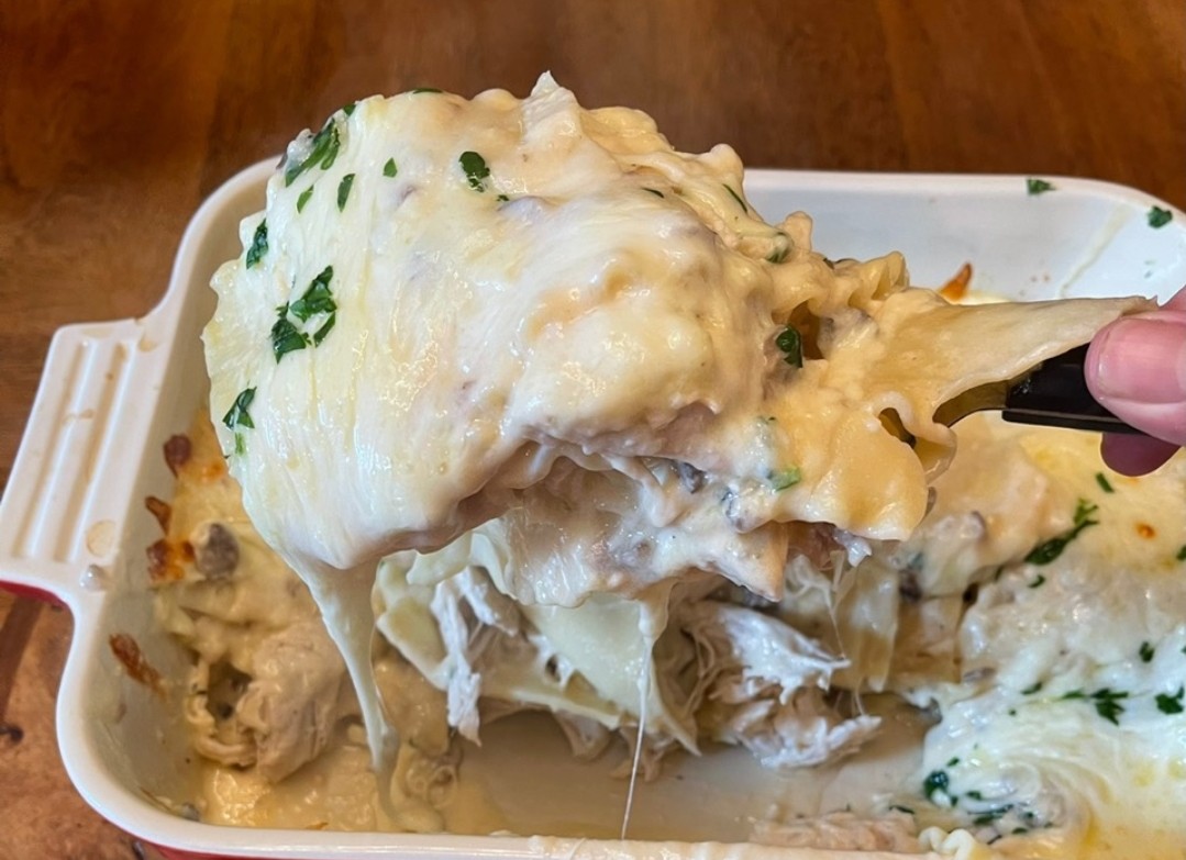 Today, I made chicken and mushrooms lasagna with white sauce and cheese.