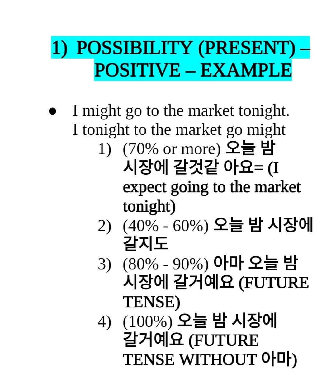 아마 오늘 밤 시장에 갈 거예요. (FUTURE TENSE)