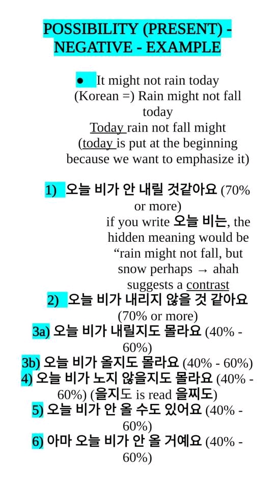 4) 오늘 비가 오지 않을지도 몰라요. (40% - 60%) (을지도 is read 을찌도)