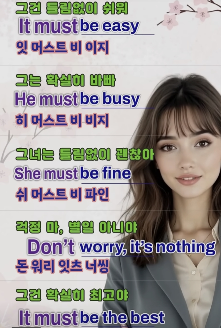 안녕하세요! 인조이영어입니다.이 영상은 바빠서 그럴 거라고 이해해 주거나(He must be busy), 소식 없는 딸이 잘 지내고 있을 거라고 믿어주거나(She must be fine), 키오스크나 스마트폰 배우는 거 별