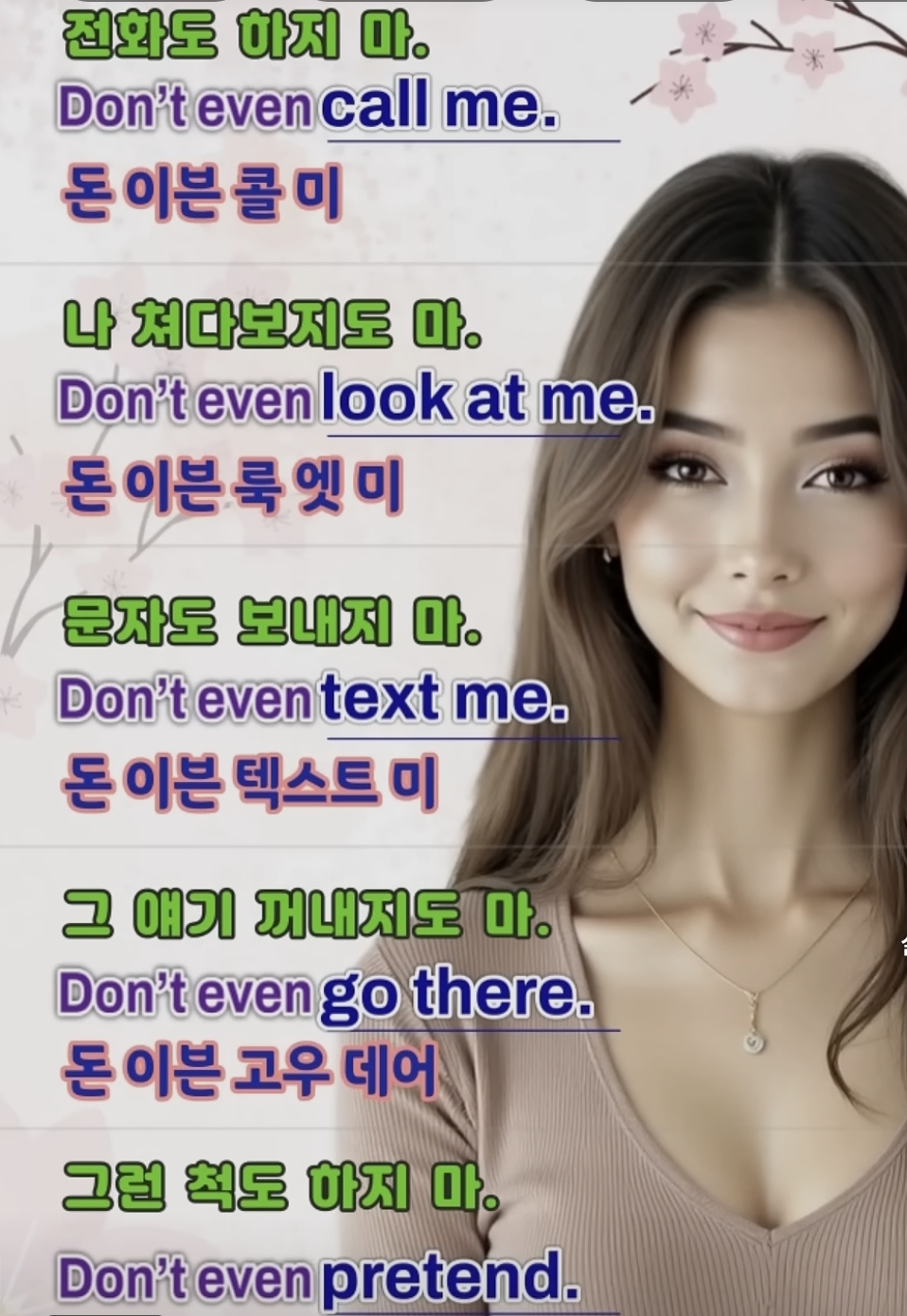 안녕하세요! 인조이영어입니다.이 영상은 화가 나서 쳐다보지도 말라고 하거나(Don't even look at me), 스팸 전화나 헤어진 연인에게 전화하지 말라고 으름장을 놓고(Don't even call me), 귀찮은 문자조차