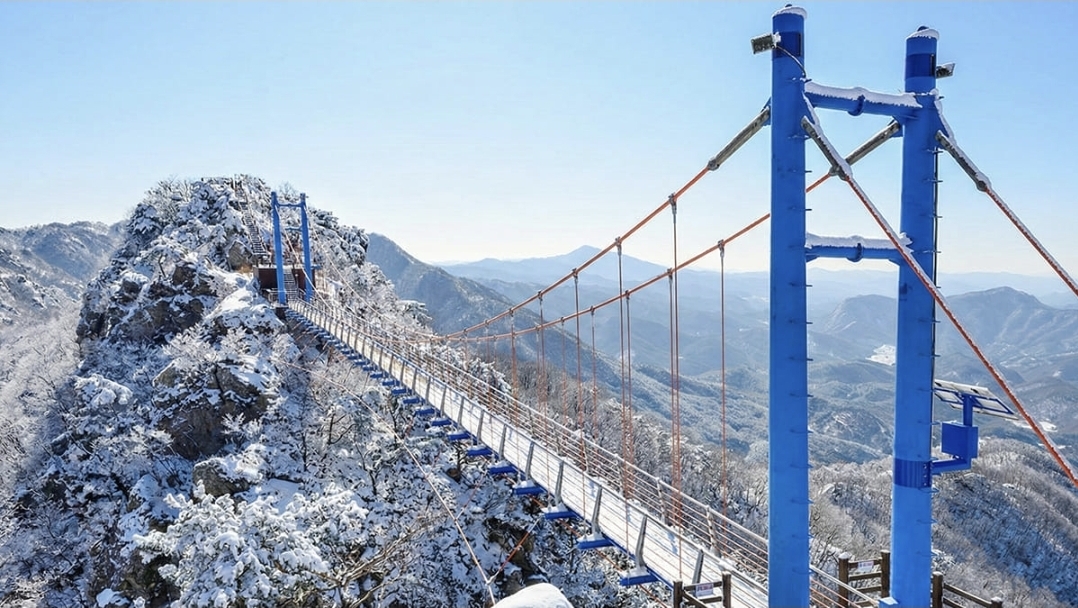 산악 현수교를 걷는 순간, 발아래로 계곡이 내려다보이는 경험은 독특합니다. 특히 겨울이면 하얀 눈이 암릉을 덮으며 구름 위를 걷는 듯한 착각을 불러일으키죠. 고도감과 설경이 만나는 지점