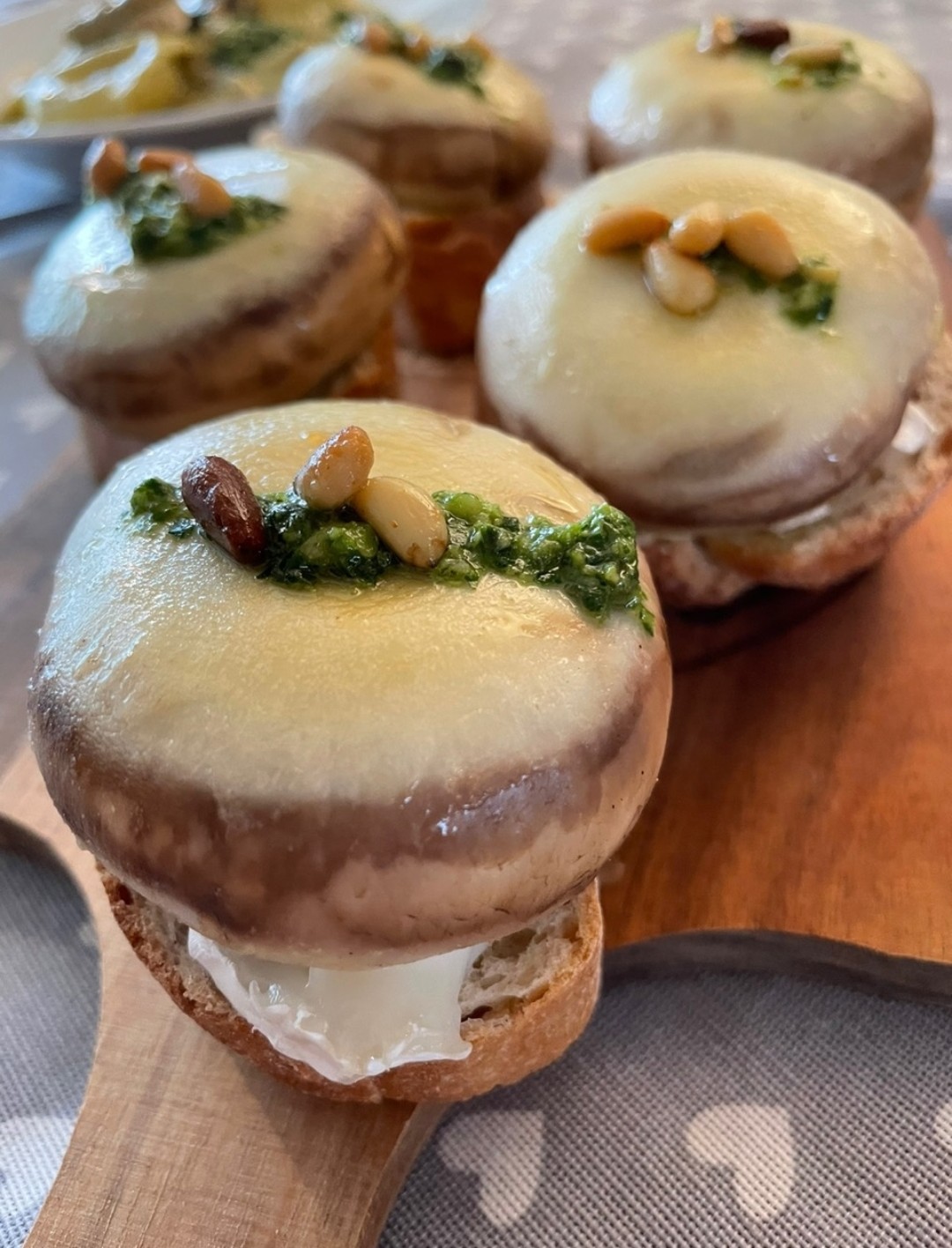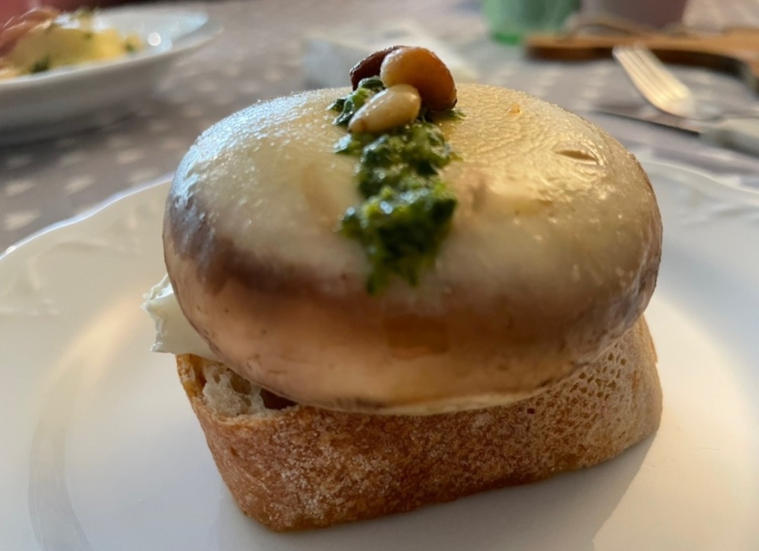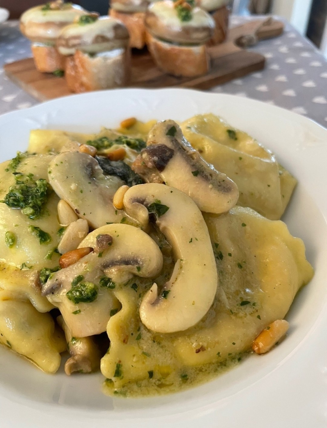 I made some bruschetta with goat cheese, green pesto, mushroom and pine nuts and then also some porcini dumplings with butter, sage and green pesto. Italy 🇮🇹 inspired me. 😌💘