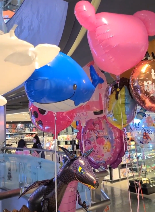 다양한 동물의 캐릭터 풍선이 있습니다.